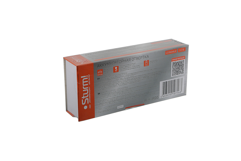 Sturm CD3404U2 — аккумуляторная многофункциональная отвертка. Является незаменимым помощником в широком спектре задач: от ремонта различной электроники, до сборки корпусной мебели. Благодаря отличным массово-габаритным показателям и выверенной эргономике инструмент максимально удобен, в том числе и при использовании в условиях с затрудненным доступом. Модель оснащена 3,7 В электромотором и развивает скорость вращения на валу шпинделя 300 об/мин, что обеспечивает эффективное применение устройства для работы с крепежными элементами разного размера и назначения. Предусмотрена электронная регулировка момента затяжки (максимальный крутящий момент — 3 Нм) — производится специальным регулятором в торцевой части инструмента и позволяет легко настроить оптимальное усилие — о достижении нужного усилия затяжки пользователя информирует специальный звуковой сигнал. Также, важными особенностями модели Sturm CD3404U2 являются встроенная функция индикации напряжения, с помощью которой можно определить находящиеся под напряжением провода скрытой проводки, трехточечная LED-подсветка, способствующая равномерному освещению рабочей зоны, возможность запуска инструмента не только клавишей пуска, но и нажатием на торцевую часть корпуса отвертки, что гарантирует дополнительное удобство при серийной работе. Питание устройства осуществляется от аккумуляторного элемента 18650 емкостью 2 Ач (входит в комплект поставки), за счет которого возможна длительная работа инструмента без подзарядки. Контролировать степень заряда аккумулятора позволяет специальный световой индикатор на корпусе устройства. Модель имеет расширенную комплектацию, куда входят зарядный кабель micro USB-C, магнитный адаптер для бит и набор бит.