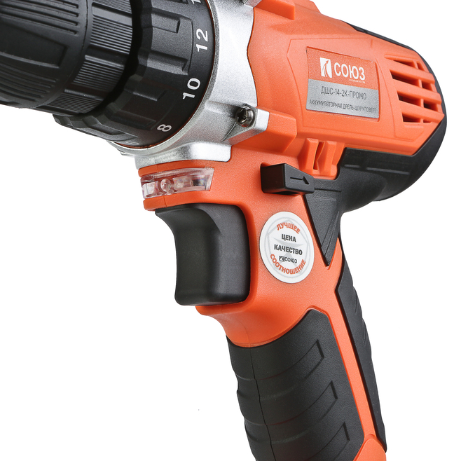 СОЮЗ ДШС-14-2К-ПРОМО — компактный и легкий, аккумуляторный 14 В двухскоростной шуруповерт бытового назначения. Благодаря корпусу из ударопрочного нейлона, инструмент обладает повышенной стойкостью к возможным механическими повреждениям, а обилие на корпусе мягких прорезиненных накладок, позволяет работать без напряжения пальцев и снижает усталость. Шуруповерт оснащен 14 В электромотором и надежным планетарным механизмом –  развивает максимальный крутящий момент до 35 Нм, что способствует эффективной работе с любым материалом: от древесины до металлопроката. Редуктор имеет две скорости: режим пониженных оборотов (0-400 об/мин) предназначен для работ с крепежом, режим повышенных оборотов (0-1400 об/мин) — для сверления отверстий. Наличие муфты регулировки усилия c 18 ступенями обеспечивает возможность изменять в широком диапазоне значения момента затяжки на валу шпинделя. Универсальности применения, также, способствует установленный на модели быстрозажимной 10 мм патрон. Важной особенностью СОЮЗ ДШС-14-2К-ПРОМО является LED-подсветка рабочей зоны с направленным, симметричным лучом, существенно облегчающая работу при недостаточном освещении. Модель комплектуется двумя литий-ионными (Li-ion) аккумуляторами емкостью 2 Ач, зарядным устройством, битой, а также пластиковым кейсом для удобства хранения и транспортировки.