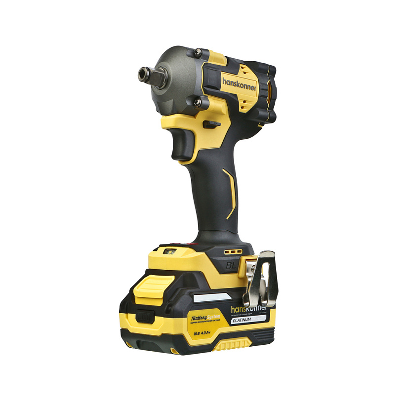 Hanskonner HCD20420BLС – аккумуляторный 18 В, ударный гайковерт с наружным квадратом 1/2″ и возможностью установки оснастки под шестигранник 1/4″ – является частью системы 1BatterySystem, обеспечивающей совместимость одного и того же аккумулятора с целым рядом наименований инструмента. Модель обладает максимально сбалансированной компоновкой: небольшие размеры корпуса и рукояти позволяют эффективное использование в условиях с затрудненным доступом, а нейтральный центр тяжести, и обилие прорезиненных противоскользящих поверхностей способствуют надежному хвату, и лучшему контролю. Гайковерт оснащен 18 В бесщеточным двигателем, характеризующимся на 30% лучшей производительностью в сравнении с коллекторными аналогами. Кроме того, бесщеточный двигатель отлично справляется с кратковременными перегрузками и не склонен к перегреву. Модель Hanskonner HCD20420BLС имеет два режима настройки крутящего момента: 280 Н м и 420 Н м – пользователь выбирает нужный, исходя из поставленных задач. Функция деликатного откручивания SoftMode обеспечивает максимально аккуратное откручивание прикипевшего крепежа, исключая его повреждение. К особенностям Hanskonner HCD20420BLC стоит отнести электронный тормоз двигателя, эффективную LED-подсветку рабочей зоны WorkingLight с блоком коллиматорных линз, создающих направленный симметричный луч, а также индикатор остаточного заряда аккумулятора PowerCheck. Дополнительному комфорту использования способствует специальная зацепная скоба крепления на пояс и страховочный ремешок на руку. Гайковерт штатно комплектуется литий-ионным (Li-ion) аккумулятором емкостью 4.0 А ч с возможностью подзарядки от него через USB выход сторонних гаджетов, импульсным зарядным устройством, USB LED-фонарем, запитываемым от АКБ. Прочный кейс единой системы хранения инструмента HANSTORAGE гарантирует сохранность устройства и аксессуаров в процессе транспортировки.