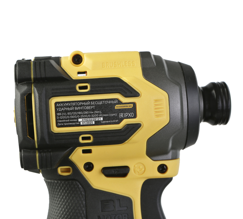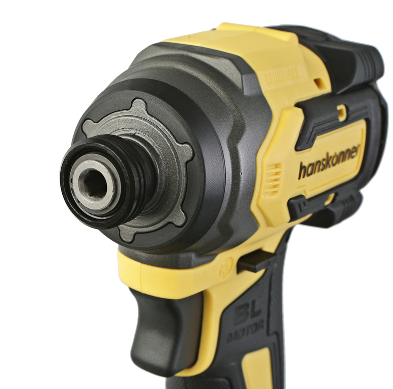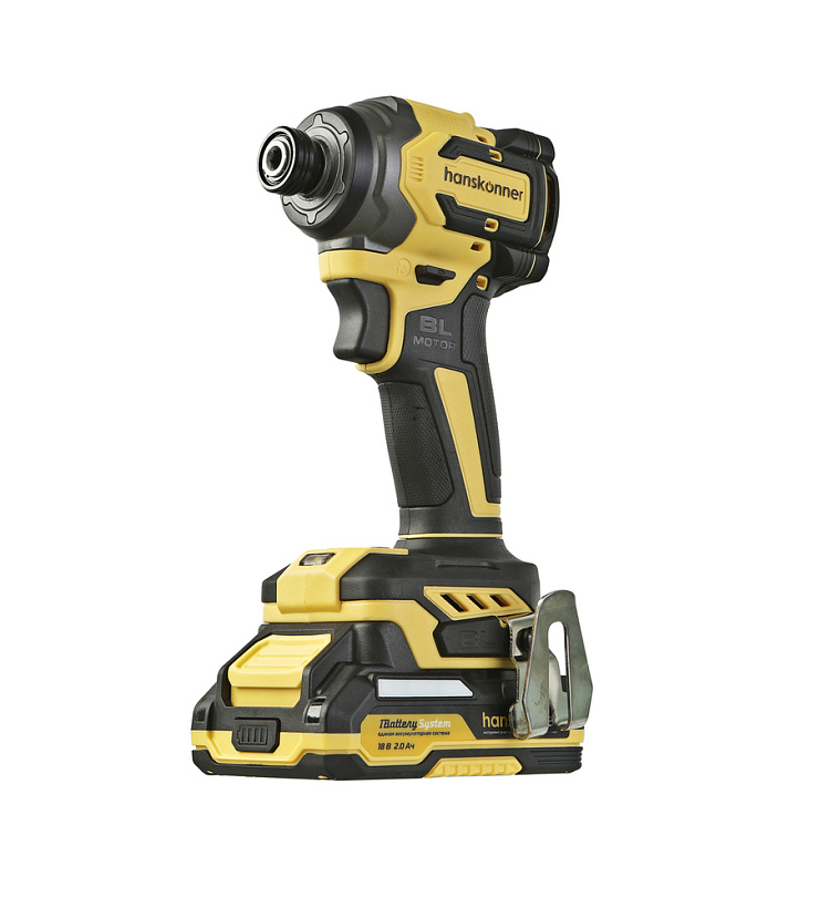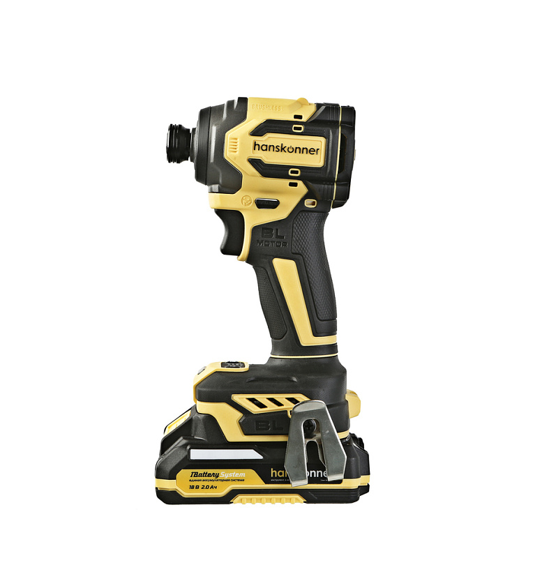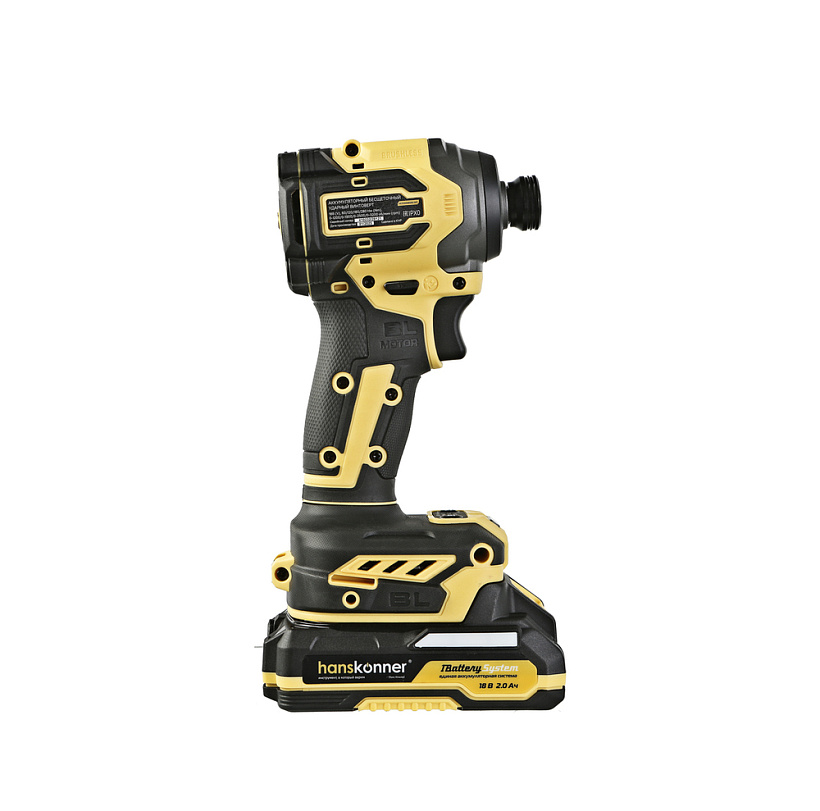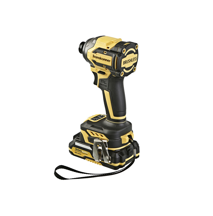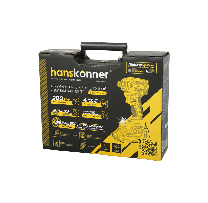 Hanskonner HCD20280BLWC – аккумуляторный 18 В, ударный винтоверт с типом гнезда под шестигранник 1/4 ″ – является частью системы 1BatterySystem, обеспечивающей совместимость одного и того же аккумулятора с целым рядом наименований инструмента. Модель обладает максимально сбалансированной компоновкой: небольшие размеры корпуса и рукояти позволяют эффективное использование в условиях с затрудненным доступом, а нейтральный центр тяжести, и обилие прорезиненных противоскользящих поверхностей способствуют надежному хвату, и лучшему контролю. Винтоверт оснащен 18 В бесщеточным двигателем, характеризующимся на 30% лучшей производительностью в сравнении с коллекторными аналогами. Кроме того, бесщеточный двигатель отлично справляется с кратковременными перегрузками и не склонен к перегреву. Благодаря применению мощного планетарного механизма, Hanskonner HCD20280BLWC уверенно демонстрирует высокие показатели крутящего момента (до 280 Н м), что позволяет работать с крепежом большой длины и диаметра. Винтоверт имеет четыре режима настройки момента затяжки: 60 Н м, 120 Н м, 180 Н м, 280 Н м – пользователь выбирает нужный, исходя из конкретного материала и крепежа. Модель оснащена функцией AutoStop, плавно останавливающей вал шпинделя сразу после откручивания крепежа. К особенностям Hanskonner HCD20280BLWC стоит отнести эффективную LED-подсветку рабочей зоны WorkingLight с блоком коллиматорных линз, создающих направленный симметричный луч, а также индикатор остаточного заряда аккумулятора PowerCheck. Дополнительному комфорту использования способствуют специальная зацепная скоба крепления на пояс и страховочный ремешок на руку. Винтоверт штатно комплектуется двумя литий-ионными (Li-ion) аккумуляторами емкостью 2.0 А ч с возможностью подзарядки от него через USB выход сторонних гаджетов, импульсным зарядным устройством, USB LED-фонарем, запитываемым от АКБ.