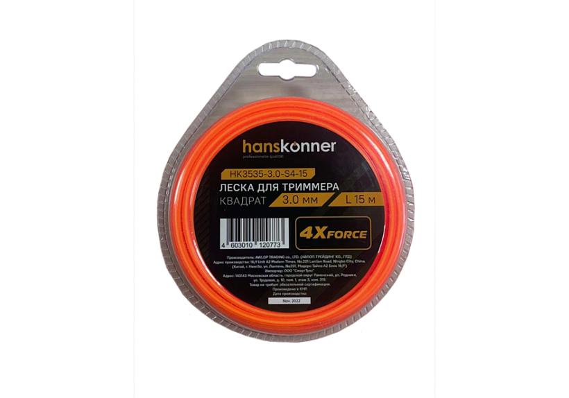 Леска для триммера, d=3.0мм, l=15 м, квадрат, блистер, Hanskonner
