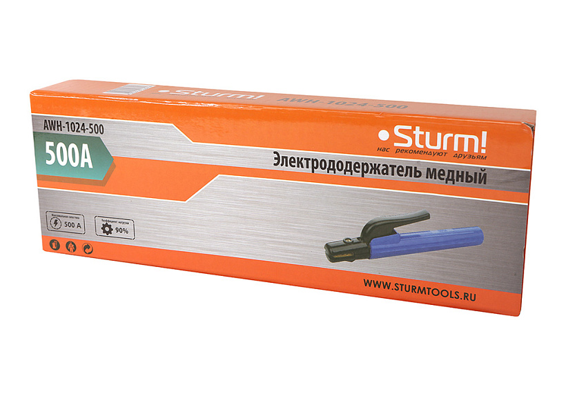 Электрододержатель 500А Sturm! AWH-1024-500 предназначен для фиксации электрода при ручной электродуговой сварке. Максимальный сварочный ток 500А. Тип пружинный.