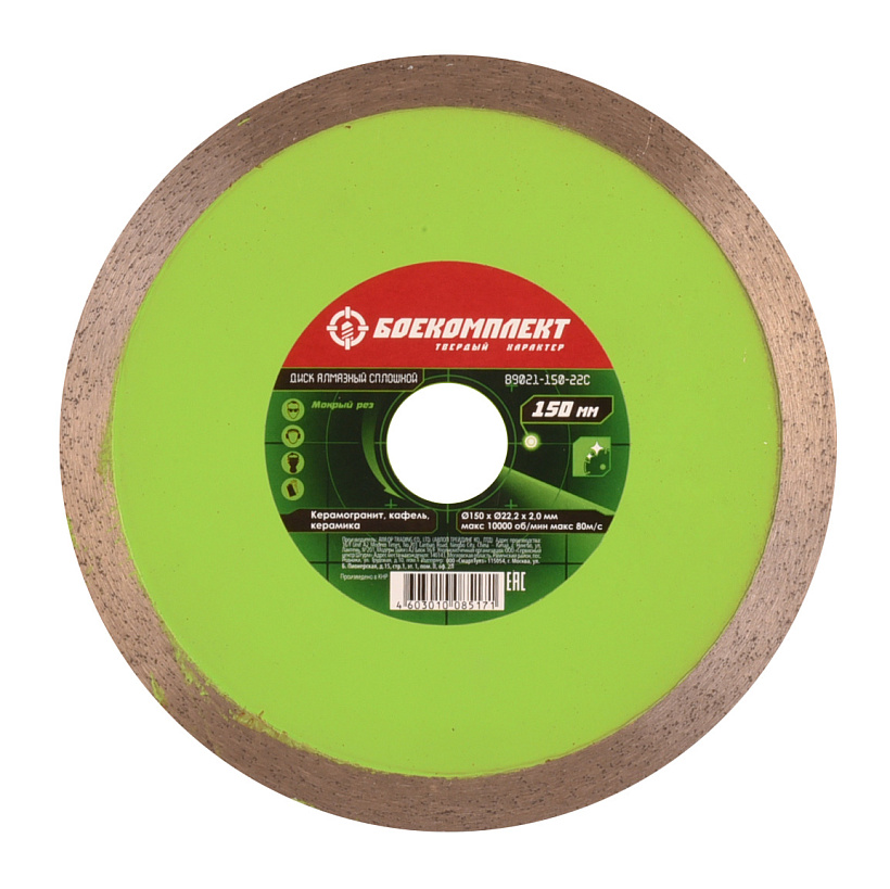 Диск алмазный сплошного типа для мокрой резки по кафелю, керамике и керамической плитке позволяет получить ровные края без сколов и трещин. Self-sharpening technology -Технология самозаточки позволяет диску сохранять высокую скорость реза даже при длительной работе. Тело диска из стали марки 65Mn и метод горячей опрессовки при производстве алмазных дисков увеличивает его износостойкость и срок эксплуатации. Правильно подобранные компоненты металлической связки обеспечивают постепенный равномерный износ алмазного слоя.