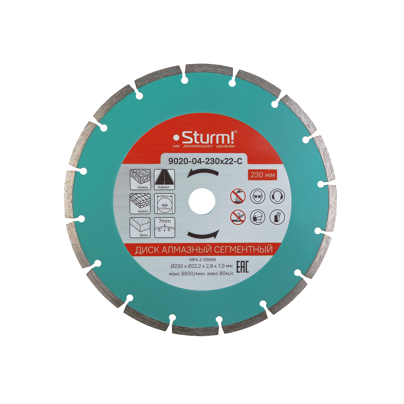 Диск алмазный Sturm! 9020-04-230x22-C сегментного типа для резки различных материалов: камня, кирпича, бетона, асфальта и тротуарной плитки. Режущая кромка с оптимальным содержанием алмазного слоя обеспечивает эффективную работу и низкую износостойкость. Промежутки между сегментами способствуют лучшему охлаждению и выбросу пыли. Тело диска, изготовленное из стали марки 65Г, обеспечивает его прочность и упругость. Переходное кольцо на 20мм в комплекте для использования с электрическим плиткорезом или иным инструментом.