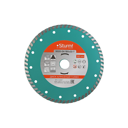 - Диск алмазный Sturm! 9020-04-180x22-T с турбо сегментом для сухой и влажной резки различных материалов: камня, кирпича, бетона, железобетона, бордюра и тротуарной плитки.