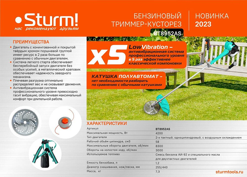 Sturm BT8952AS – надежная бензиновая коса для обработки приусадебных территорий больших площадей (более 1000 кв. метров). Модель оснащена производительным бензиновым двухтактным двигателем рабочим объемом 58 куб см и мощностью 4.2 кВт / 5 л. с., прямой неразъемной усиленной штангой с высокопрочным валом внутри и мощным редуктором, благодаря чему является универсальной и способна выполнять различные задачи: инструмент уверенно справляется не только со скашиванием мягкой и жесткой переросшей травы, но и эффективен при работе с зарослями кустарника, при условии установки соответствующей оснастки, а также может использоваться в тандеме с культиваторными насадками для обработки почвы. Модель проста и максимально удобна в эксплуатации – снабжена Т образной рукоятью «велосипедного типа» – она обеспечивает лучший контроль и позволяет при работе захватывать большую площадь за один заход. Легкость запуска инструмента гарантируют механизм облегченного старта с дополнительной пружиной и праймер. В расширенную штатную комплектацию Sturm BT8952AS помимо режущей оснастки (косильная головка, металлический трехзубый нож) включен двухплечевой ранцевый ременной подвес с защитным набедренником, способствующий снижению нагрузки на позвоночник оператора, за счет ее равномерного распределения.