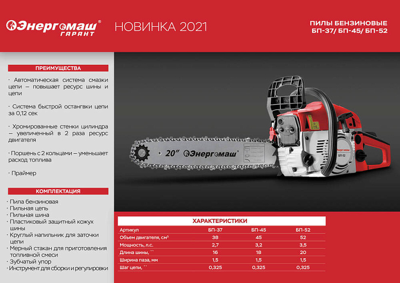 Модель выделяется ускоренным выходом на рабочий режим и высокой скоростью цепи, что увеличивает общую производительность.