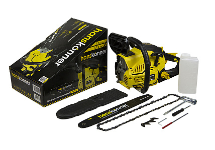 - Безопасность работы обеспечивается предохранительной клавишей, предотвращающей случайное нажатие газа, ограничителем цепи, защитным щитком для правой руки, а также цепным тормозом, активируемым принудительно либо силой инерции.
