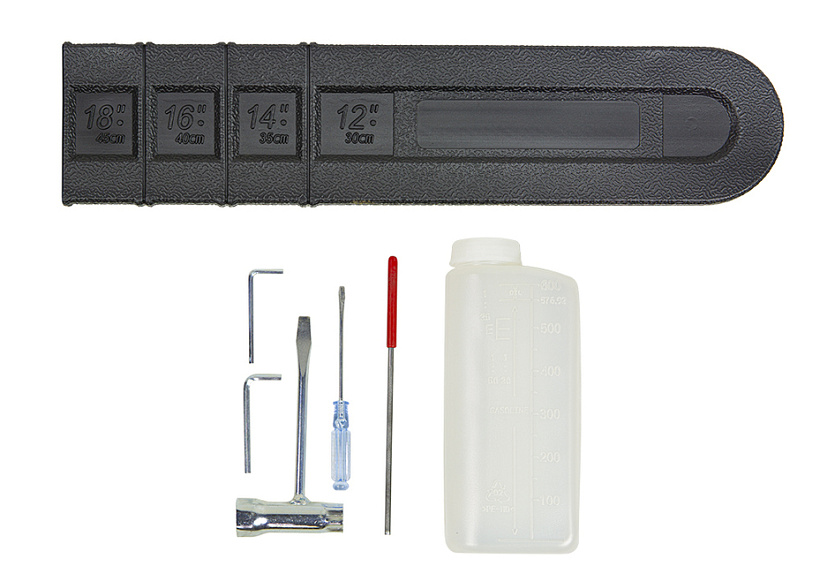 Пила бензиновая Пильная цепь Пильная шина Пластиковый защитный кожух шины Отвертка Круглый напильник для заточки цепи Мерный стакан для приготовления топливной смеси Комбинированный ключ Шестигранные ключи (2 шт:3 мм, 4 мм) Зубчатый упор с шурупами Инструкция по эксплуатации