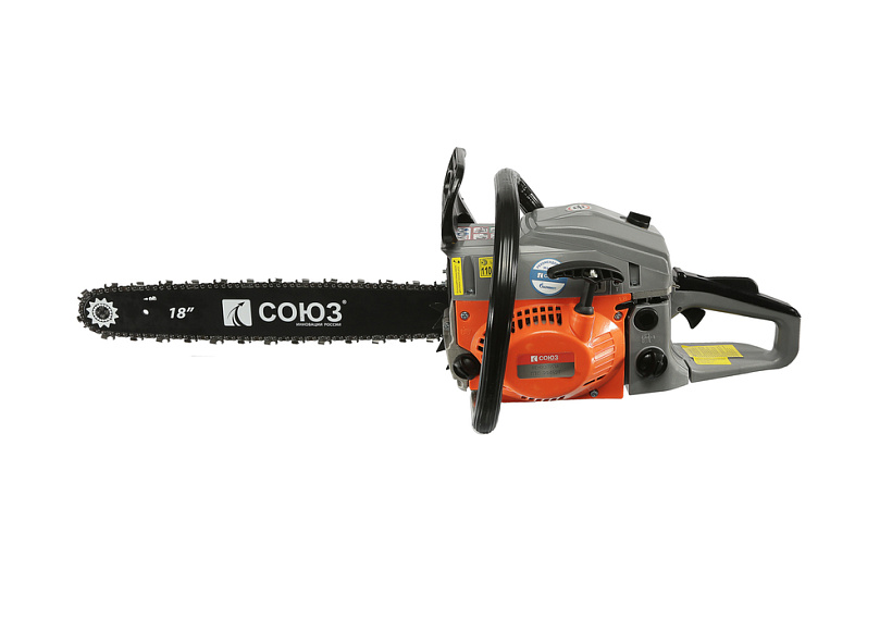 СОЮЗ ПТС-99452Т – надежная универсальная бензиновая пила бытового класса. Модель рассчитана на широкий спектр работ: от расчистки лесных насаждений и благоустройства парковых зон до эксплуатации на приусадебных территориях. Оснащена мощным и экономичным двухтактным двигателем рабочим объемом 45 куб см (мощность 2.35 кВт) и пильной гарнитурой увеличенной размерности – 455 мм, что позволяет эффективно использовать инструмент для распиловки древесины различной толщины. Благодаря нейтральному центру тяжести, инструмент отлично сбалансирован, хорошо лежит в руках и позволяет с легкостью выполнять распилы под разными углами. Модель проста в эксплуатации и не вызовет затруднений у пользователей, не обладающих достаточными навыками работы с бензопилами. Легкость запуска гарантируют система облегченного старта со специальной дополнительной пружиной и праймер, позволяющий уверенный пуск инструмента в условиях низких температур и после длительных перерывов в эксплуатации. Возможность безынструментального доступа к карбюратору, фильтрующему элементу и свече зажигания обеспечивает удобство обслуживания пилы даже в самых неприспособленных условиях.
