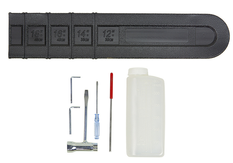 Пила бензиновая Пильная цепь Пильная шина Пластиковый защитный кожух шины Отвертка Круглый напильник для заточки цепи Мерный стакан для приготовления топливной смеси Комбинированный ключ Шестигранные ключи (2 шт:3 мм, 4 мм) Зубчатый упор с шурупами Инструкция по эксплуатации