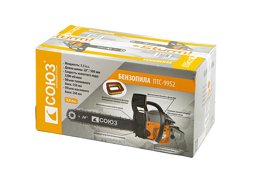 Бензопила СОЮЗ ПТС-9952. "Старшая" модель в данной линейке бензопил. Поставляется с шиной 50 см и двигателем объемом 52 см3. Имеет имеет прочную конструкцию и предоставляет оптимальную мощность для эффективной работы.