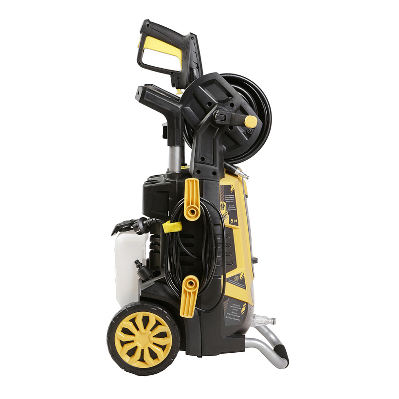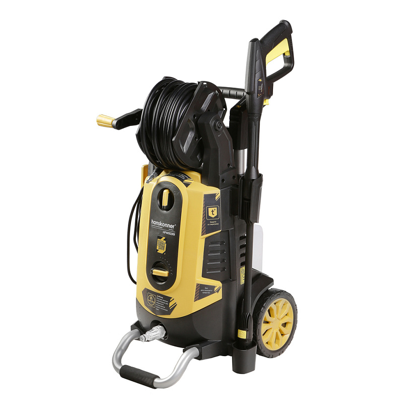 Hanskonner HPW9230I – универсальная производительная мойка высокого давления. Объединяет в себе компактность, отличную эргономику и широкие функциональные возможности. Главная особенность модели – наличие мощного индукционного бесщеточного двигателя, в сравнении с коллекторными аналогами обладающего лучшей износостойкостью и долговечностью, а также характеризующимся низким уровнем шума. Встроенная термозащита и автоматическая система с микровыключателем мгновенной остановки двигателя Total Stop гарантируют безопасную и энергосберегающую работу. Применение в конструкции трёхплунжерной алюминиевой помпы 3D Pump, позволяет мойке демонстрировать высокие показатели производительности (до 450 л/час), и одни из лучших, среди моек аналогичной мощности, показатели по выходному давлению (максимальное давление – 195 бар / рабочее давление – 130 бар) – все это дает возможность с максимальной эффективностью удалять даже самый стойкие загрязнения. Мойка оснащена функцией закачки и фильтрации воды "SelfPrime", обеспечивающей полноценную эксплуатацию устройства даже при отсутствии условий для подключения к стационарному водопроводу – в качестве источника воды можно использовать как водоемы, так и любые подручные емкости. Установленные на модели десятиметровый шланг высокого давления и пятиметровый сетевой кабель гарантируют значительную по площади рабочую зону: позволяют свободно мыть легковой автомобиль, очищать крыши дачных построек и другие объекты без необходимости передвигать мойку с места на место. Для защиты шланга от нежелательных перегибов модель имеет штатную катушку для его намотки, а также оснащена системой "TurnUnwind" для удобства хранения и возможности быстрого разматывания сетевого кабеля. Легкости подключения шланга и оснастки способствуют специальные быстросъемные соединения QuickConnect. Дополнительную функциональность обеспечивает установленный в задней части корпуса бачок для моющего средства с регулировкой подачи, благодаря которому пользователь получает возможность предварительной обработки моющим составом загрязненной области, не прибегая к использованию дополнительного оборудования. В штатную комплектацию мойки также включены внешний пеногенератор, для создания качественной густой пены, дополнительная роторная фреза "TurboNozzle" для работы с сильными загрязнениями, а также специальная защита от опрокидывания, предотвращающая случайное повреждение мойки в ходе использования. Благодаря большим транспортировочным колесам и выдвижной телескопической рукояти модель максимально удобна в транспортировке.