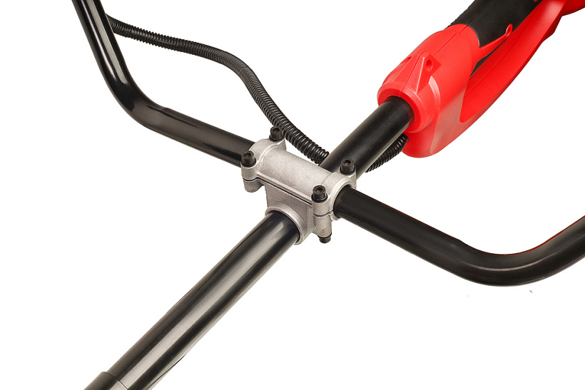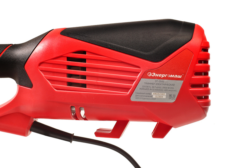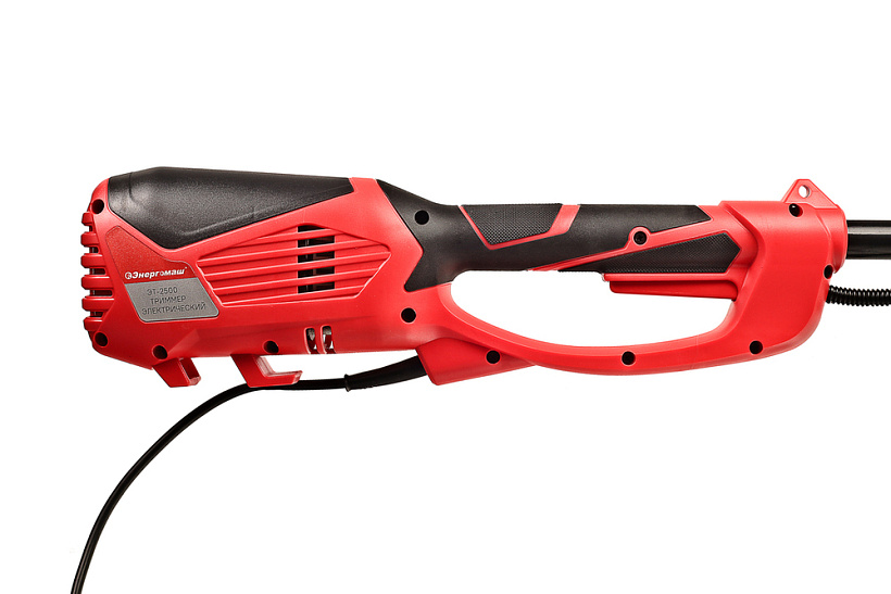 Энергомаш ЭТ-2500 – универсальная мощная электрокоса для ухода за приусадебной территорией. Инструмент имеет компоновку с верхним расположением двигателя, что дает возможность использовать его для скашивания мокрой травы, так как исключается непосредственный контакт влаги с электрочастью. Модель оснащена производительным 2,5 кВт мотором, развивающим максимальную частоту вращения режущей оснастки 6000 об / мин, что способствует эффективности и качеству работы. Высокие показатели по мощности, а также наличие в конструкции металлического приводного вала и прочного редуктора позволяют уверенно применять Энергомаш ЭТ-2500   в тандеме с различными типами оснастки, включая не только косильные катушки, но и металлические трезубые ножи для скашивания жесткой перезрелой травы и бурьяна. Важной особенностью электрокосы является разборная двухсоставная штанга, обеспечивающая повышенное удобство при транспортировке и хранении – в случае необходимости, пользователь может быстро и с минимальными усилиями разобрать штангу, тем самым, уменьшив ее габаритную длину. Благодаря отличной эргономике и относительно небольшой массе инструмент очень удобен в использовании. Значительный комфорт для пользователя обеспечивает применение на модели Энергомаш ЭТ-2500 Т – образной рукояти «велосипедного типа» – она позволяет лучше контролировать электрокосу в процессе работы. Рукоять имеет возможность продольной регулировки. Для надежной фиксации сетевого удлинителя к инструменту в нижней части корпуса предусмотрен специальный зацепной крюк. В штатную комплектацию косы входят катушка с леской и наплечный ремень.