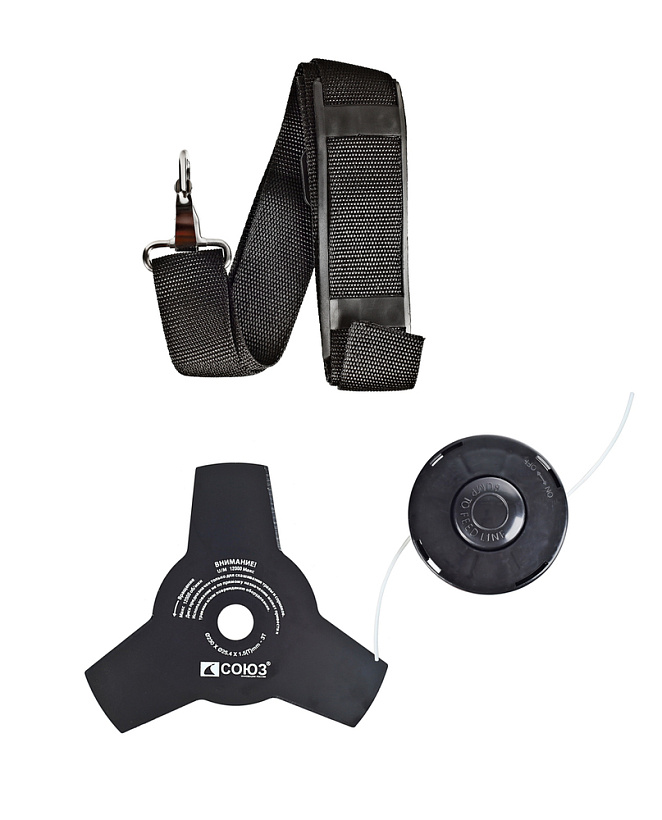 Щиток 1 шт. Пластиковый ключ 1 шт. Шпулька с леской 1 шт. Трехлопастной нож 1 шт Рукоятка 1 компл. Плечевой ремень 1 шт. Накидной ключ 1 шт. Шестигранный ключ 2 шт. Гайка 2 шт Пружинная шайба "гровер" 2 шт Зубчатая шайба 1 шт Шплинт 1 шт Винт 2 шт