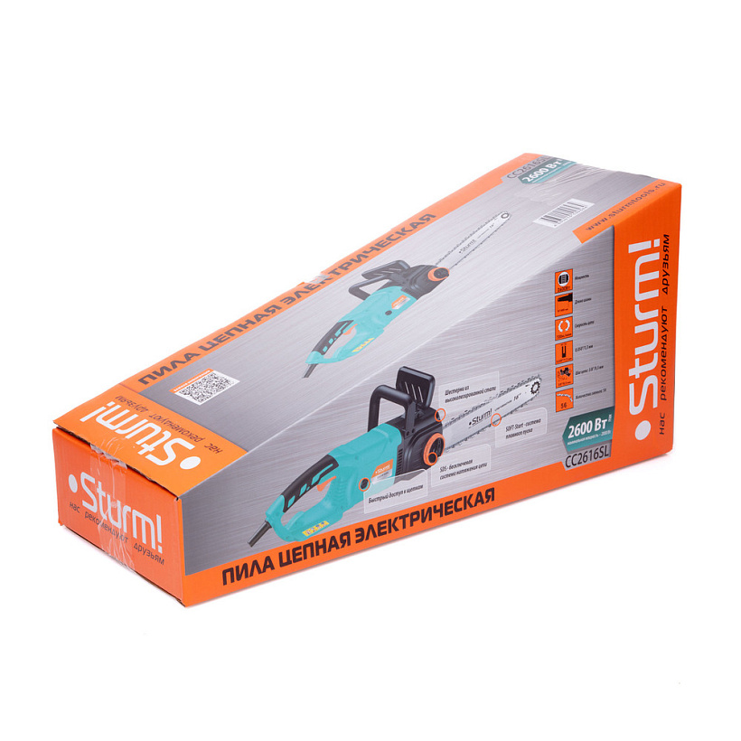 Sturm CC2616SL – производительная электрическая цепная пила бытового класса. Инструмент имеет продольную компоновку двигателя и благодаря этому, отлично приспособлен к использованию в условиях с затрудненным доступом. Модель оснащена электромотором мощностью 2.6 кВт и развивает скорость движения цепи в 720 м / мин – это способствует как высокой скорости единичного пропила, так и общей производительности при значительных объемах работы. Для обеспечения высокого ресурса, особое внимание уделено наиболее нагруженным элементам конструкции: электромотор покрыт несколькими изоляционными слоями термостойкого лака, вал приводной звездочки установлен на шарикоподшипниках, шестерни редуктора выполнены из высоколегированной стали. Кроме того, применение шестерен с конической формой зуба позволило снизить уровень шума при работе. Для комфорта пользователя, модель Sturm CC2616SL получила бесключевую систему натяжения цепи, позволяющую производить регулировку натяжения цепи без применения вспомогательного инструмента. Безопасность использования гарантируют тормоз экстренной блокировки цепи Smart Brake, мгновенно останавливающий цепь при срабатывании тормозного щитка или при отпускании клавиши пуска, а также защита от непреднамеренного запуска. Удобству обслуживания способствует функция быстрого доступа к щеткам, позволяющая производить их замену без демонтажа элементов корпуса.