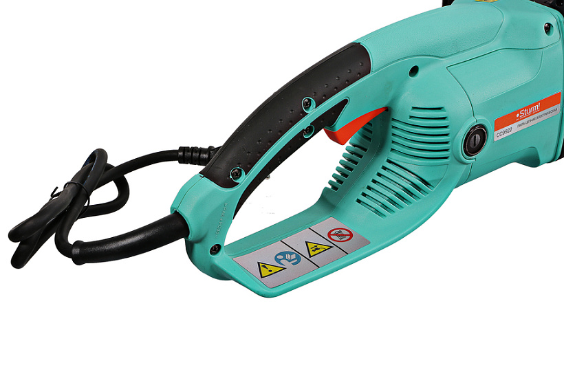 Sturm CC9922 — производительная электрическая цепная пила бытового назначения. Главная особенность модели, отличающая ее от большинства цепных пил — наличие безмасляной пильной гарнитуры. Шина инструмента изготовлена из специальной износостойкой стали и благодаря наличию воздухоподводящих каналов имеет развитую систему систему охлаждения. Это гарантирует немало преимуществ: пила не нуждается в заправке маслом и, как следствие, в постоянном контроле его уровня, исключается необходимость регулярной прочистки маслоподающего канала от опилок, инструмент не оставляет масляные пятна при транспортировке или хранении. Пила максимально проста в обслуживании и всегда готова к работе, вне зависимости от температурных условий и наличия специального масла для смазки пильной гарнитуры! Инструмент оснащен электромотором мощностью 2,2 кВт и развивает скорость движения цепи в 360 об/мин — это способствует как высокой скорости единичного пропила, так и общей производительности при значительных объемах работы. Для обеспечения высокого ресурса особое внимание уделено наиболее нагруженным элементам конструкции: электромотор покрыт несколькими изоляционными слоями термостойкого лака и имеет дополнительное бронирование армирующей нитью, вал приводной звездочки установлен на шарикоподшипниках, шестерни редуктора выполнены из высоколегированной стали. Кроме того, применение шестерен с конической формой зуба позволило снизить уровень шума при работе. Для удобства пользователя на модели Sturm CC9922 установлен автоматический механизм регулировки цепи, обеспечивающий ее оптимальное натяжение в процессе работы. За счет предусмотренной функции быстрого доступа к щеткам, их замена осуществляется без разбора элементов корпуса. Безопасность использования гарантируют механический тормоз экстренной блокировки цепи и защита от непреднамеренного пуска.