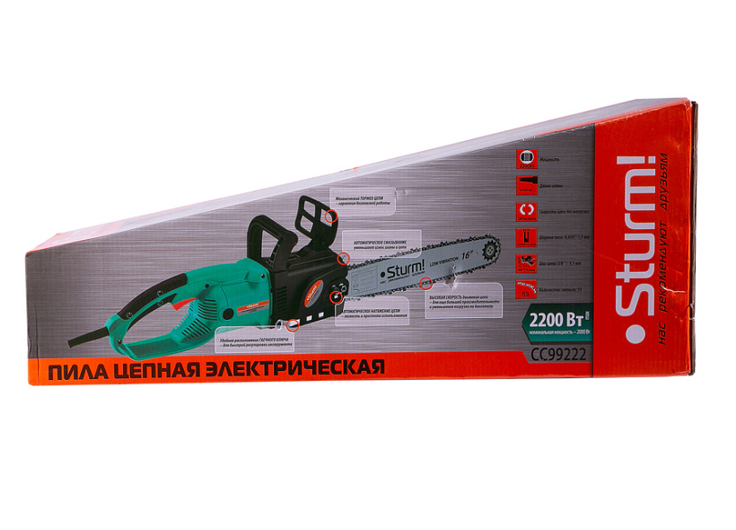 Sturm CC99222 — производительная электрическая цепная пила бытового назначения. Благодаря компоновке с продольным расположением электромотора и, как следствие, небольшой ширине корпуса, нейтральному центру тяжести и хорошей эргономике, инструмент обладает отличной маневренностью, облегчая выполнение пропилов под различными углами, а также позволяя эффективное использование в условиях ограниченного пространства. Модель оснащена электромотором мощностью 2.2 кВт и развивает скорость движения цепи в 360 м/мин — это способствует как высокой скорости единичного пропила, так и общей производительности при значительных объемах работы. Для обеспечения высокого ресурса инструмента особое внимание уделено наиболее нагруженным элементам конструкции: электромотор покрыт несколькими изоляционными слоями термостойкого лака и имеет дополнительное бронирование армирующей нитью, вал приводной звездочки установлен на шарикоподшипниках, шестерни редуктора выполнены из качественной легированной стали. Кроме того, применение шестерен с конической формой зуба позволило снизить уровень шума при работе. Инструмент оборудован автоматической системой подачи масла к пильной гарнитуре — при холостом режиме работы смазка приостанавливается. Есть возможность ручной регулировки количества подаваемого масла. Электропила проста в обслуживании и эксплуатации. Для удобства пользователя на модели Sturm CC99222 установлен автоматический механизм регулировки цепи, обеспечивающий ее оптимальное натяжение в процессе работы. За счет предусмотренной функции быстрого доступа к щеткам, их замена осуществляется без разбора элементов корпуса. Безопасность использования гарантируют механический тормоз экстренной блокировки цепи и защита от непреднамеренного пуска. Длинный трехметровый сетевой кабель позволяет расширить рабочую зону, не используя дополнительный сетевой удлинитель.