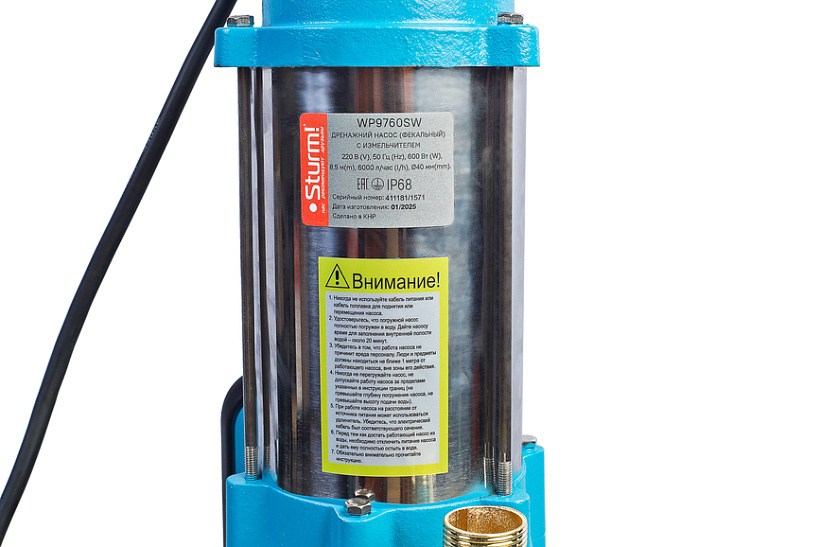 Sturm! WP9760SW – погружной дренажный насос – предназначен для откачивания жидкости из выгребных ям, септиков, канализационных коллекторов. Имеет комбинированный корпус: основание выполнено из прочного чугуна – это необходимо для свободного погружения насоса в сточные водные массы, корпус двигателя – из нержавеющей стали, стойкой к воздействию агрессивной среды. При мощности электромотора в 600 Вт модель характеризуется высокой производительностью – способна перекачивать за час до 6000 литров жидкости и обеспечивать ее подачу на высоту до 8,5 метров, осуществляя забор с глубины до 5 метров. Максимальная температура жидкости для насоса не должна превышать 35 градусов. Важная особенность модели Sturm! WP9760SW – наличие в конструкции специального режущего узла, позволяющего измельчать крупные фракции, а также изготовленной из чугуна крыльчатки, устойчивой к окислительным воздействиям. Насос снабжен поплавковым выключателем, который автоматически способен включать / выключать насос в зависимости от изменения уровня вод. Предусмотрена встроенаая термозащита – она автоматически отключает насос при перегреве и позволяет возобновить работу при последующем остывании до рабочей температуры. Установлен съемный выходной штуцер на резьбовом соединении, позволяющий кроме рукава подсоеденять ПНД или стальную трубу через резьбовое соединение.е.