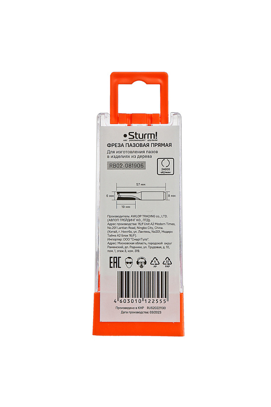 Фреза пазовая прямая с двойным лезвием dxhxl 6x19x57 мм, хв.8 Sturm!