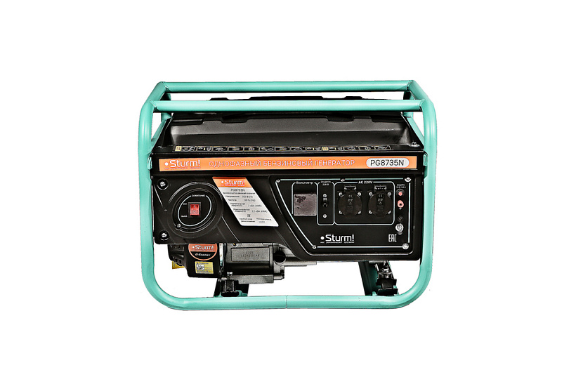 Sturm PG8735N – мощный универсальный однофазный бензиновый генератор для частного или производственного использования. Аппарат предназначен для мобильного обеспечения электроэнергией потребителей при отсутствии электроснабжения или в походных условиях. Имеет классическую компоновку: двигатель и альтернатор размещены внутри прочного рамного каркаса из закаленных труб – это позволяет защитить агрегаты бензинового генератора от возможных механических повреждений в ходе эксплуатации, а также обеспечить легкость перемещения и установки. Модель оснащается четырехтактным бензиновым двигателем KM170F рабочим объемом 212 см3 с верхним расположением клапанов (OHV) и воздушным охлаждением мощностью 5.15 кВт (7.0 л. с.) Благодаря ряду технических решений: коленчатому валу повышенной прочности, усиленной цилиндро-поршневой группе, чугунной гильзе цилиндра и ее алмазной хонинговке, силовой агрегат надежен и неприхотлив в использовании. Бензиновый генератор Sturm PG8735N получил синхронный, с щеточно-коллекторным узлом, тип альтернатора. Он способен легко переносить индуктивные нагрузки и позволяет запитывать даже достаточно мощный строительный электроинструмент. За автоматическую стабилизацию выходного напряжения отвечает встроенная система AVR (Automatic Voltage Regulation). Панель управления оснащена контрольным цифровым вольтметром, двумя пыле-влагозащищенными розетками переменного тока 220В/16А с автоматическими подпружиненными крышками и клеммным выходом постоянного тока 12В/ 5А для универсального обеспечения электропитания потребителей различного класса. Генератор имеет систему энергобезопасности, которая принудительно отключает агрегат при превышении допустимой нагрузки или коротком замыкании, а также оснащен системой аварийной остановки двигателя при критически низком уровне масла. Тип запуска – с помощью ручного стартера.