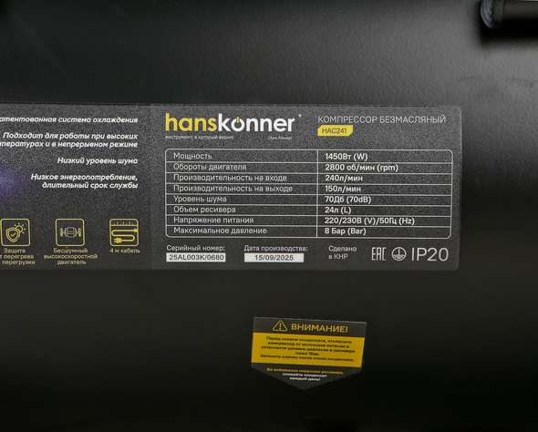 HAC241 Компрессор воздушный безмасляный Hanskonner