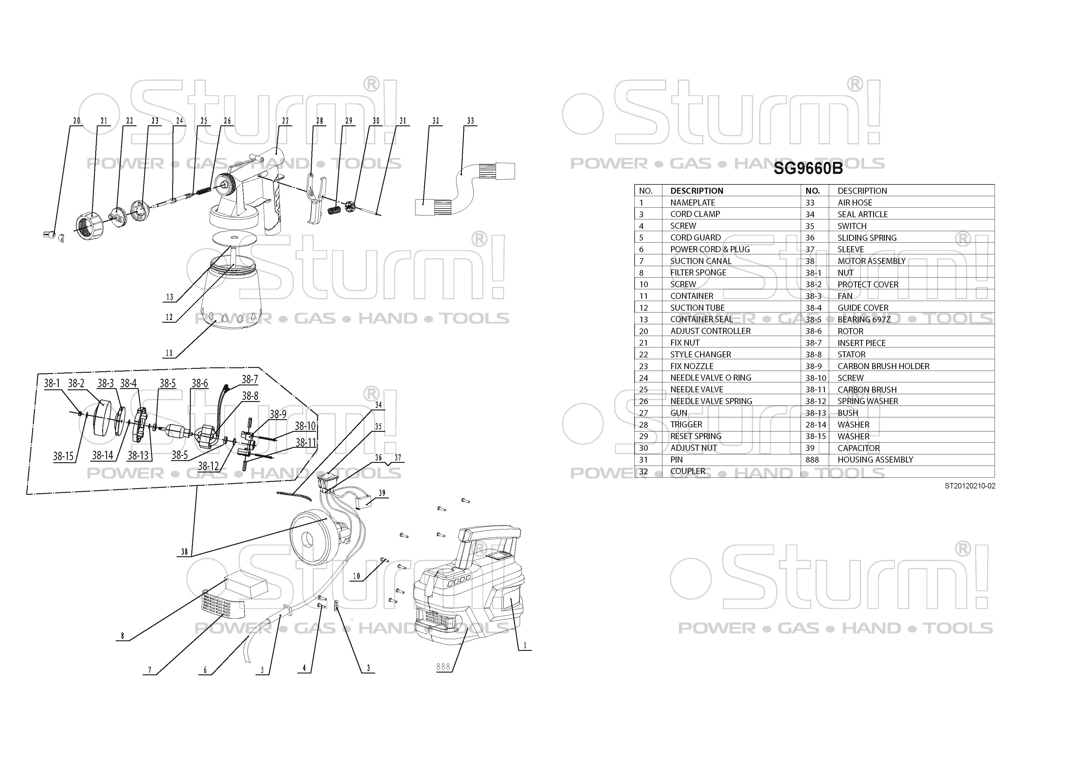 Sturm SG9660B – универсальный электрический краскораспылитель с выносной базой. Модель проста в эксплуатации и не вызовет затруднений у пользователей, не обладающих достаточными навыками работы с краскораспылителями. Главная особенность Sturm SG9660B в его компоновке: силовой блок, куда входят электромотор и нагнетающая турбина, и распылительный пистолет конструктивно разделены между собой и представляют отдельные элементы, взаимосвязь между которыми осуществляется лишь за счет двухметрового гофрированного шланга для подачи воздуха. Такая конструкция имеет существенные достоинства: лучший контроль распылительного пистолета, что способствует равномерному нанесению слоя краски на поверхность, отсутствие необходимости применения дополнительного сетевого удлинителя, за счет возможности работать на расстоянии до 4 х метров от розетки, возможность работы в условиях стесненного пространства, а также отличная приспособленность к высотным работам – в этом случае, силовой блок не сковывает движений пользователя, так как подвешивается на ремне (входит в штатную комплектацию) на плечо или за спину.