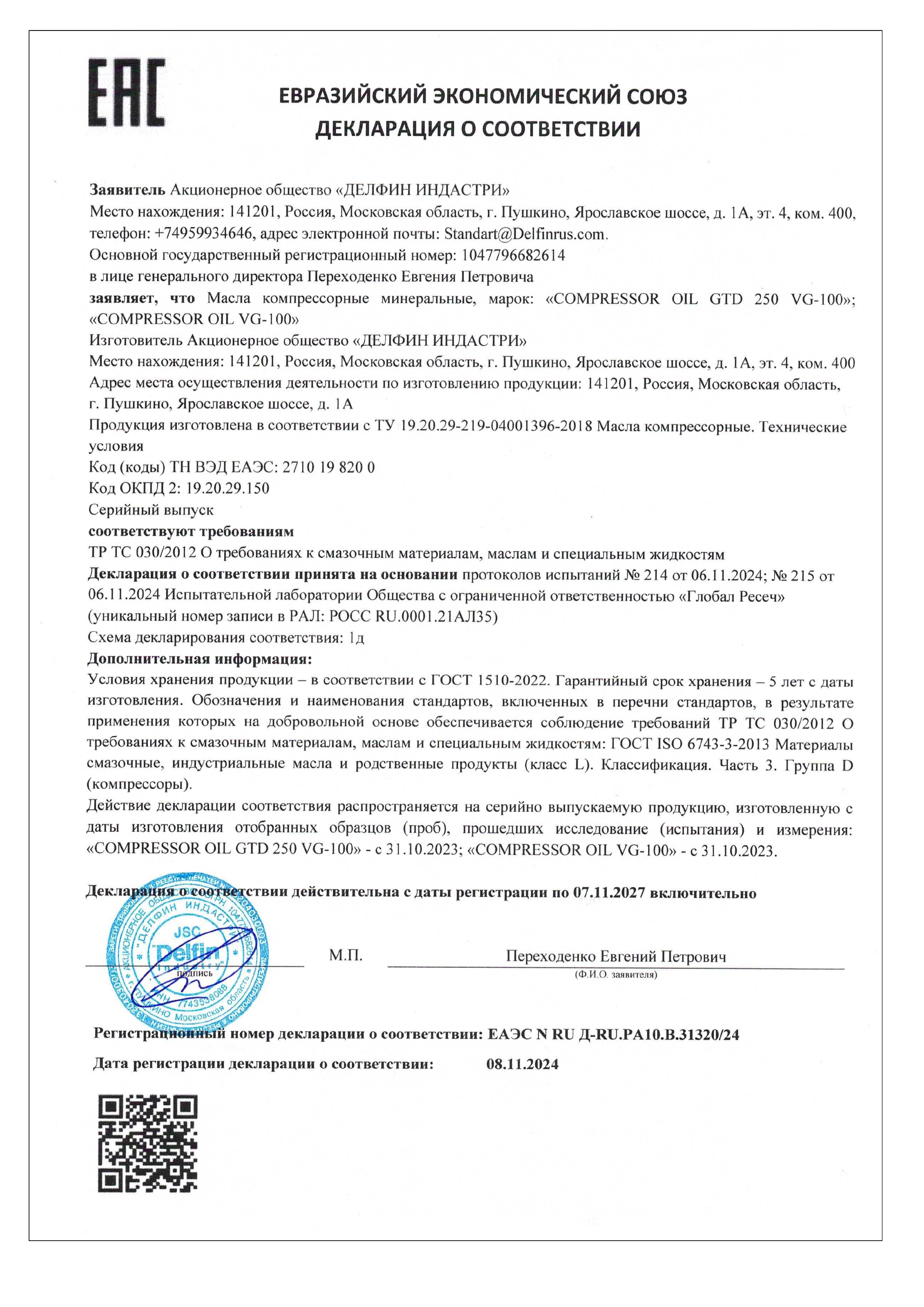 Высокая температура самовоспламенения обеспечивают безопасную работу компрессора