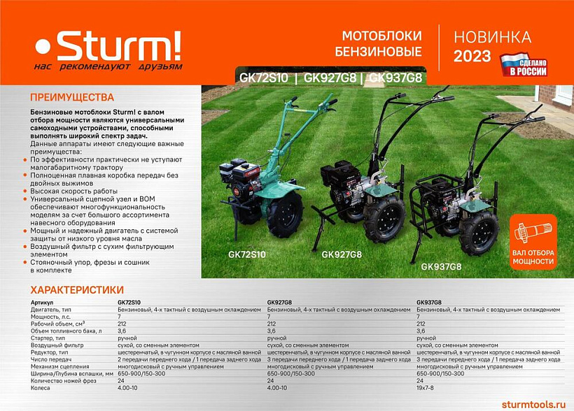 Мотоблок бензиновый Sturm! GK937G8 — 3-х скоростная модель (понижающая, основная и повышающая) с валом отбора мощности.