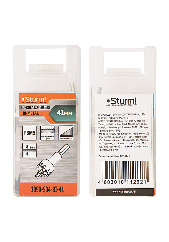 Коронка биметаллическая, 41 мм, по тонколистовому металлу, центрирующее сверло, Sturm!