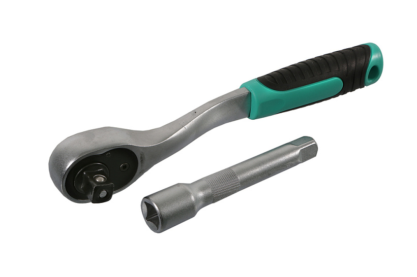 Двухкомпонентня изогнутая рукоятка трещотки обеспечивает надежный хват и комфортную работу с инструментом.Инструменты и аксессуары изготовлены из хромованадиевой стали, обеспечивающей повышенную износостойкость и защиту от коррозии.