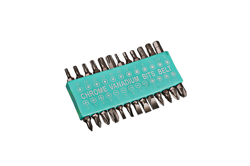 25 бит: PH: 0,1,2,3; SL:3,4,5,6,7 мм; PZ: 0, 1,2,3; TORX: 10,15,20,25,30,40; HEX: 2,3,4,5,5,56 мм;