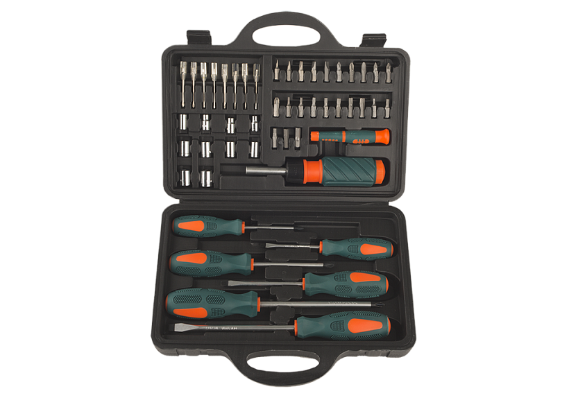 В прочном и удобном пластиковом кейсе: отвертки SL5x75, SL6x100, SL8x150; PH1x75, PH2x100, PH3x150; Держатель с храповиком; Мини ручка, Адаптер, Отвёртки для точной механики: SL1.6x35, SL2.0x35, SL2.4x35, SL3.0x35 мм; PH1.6x35, PH2.0x35, PH2.4x35, PH3.0x35 мм; Торцевые головки: 4.5.6.7.8.9.10.11.12.13 мм; 22 биты: SL3, SL4, SL5, SL6, SL7; PH1, PH2, PH3; PZ1, PZ2, PZ3; TORX: Т10, Т15, Т20, Т25, Т27, Т30, Т40; HEX3, HEX4, HEX5, HEX6