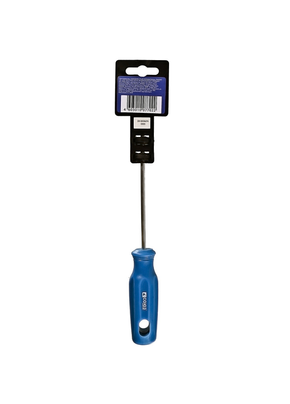 Эргономичная рукоятка из ПВХ с удобным отверстием для подвеса. Рабочая часть отвертки выполнена из высоколегированной хромованадиевой инструментальной стали и имеет высокую твердость и прочность, что определяет длительный срок службы инструмента.