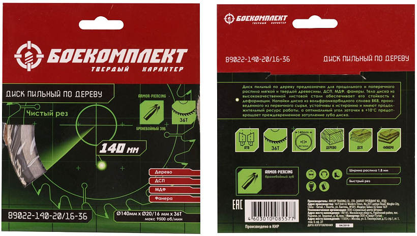 Пильный диск по дереву 140x20/16мм, 36 зубьев, БОЕКОМПЛЕКТ
