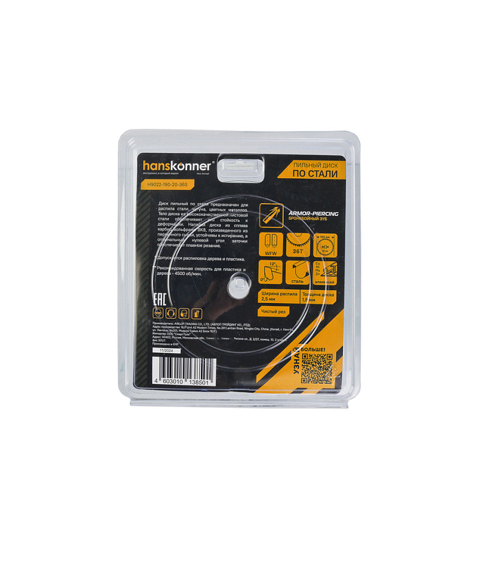Пильный диск по СТАЛИ 190x20мм, 36 зубьев, Hanskonner