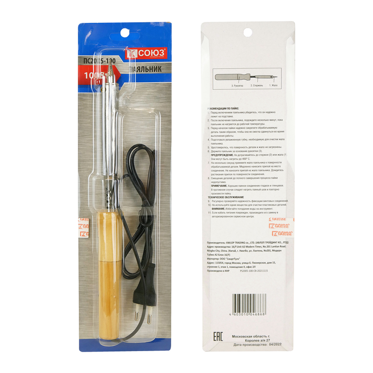 Паяльник электрический 100 Вт, деревянная рукоятка СОЮЗ