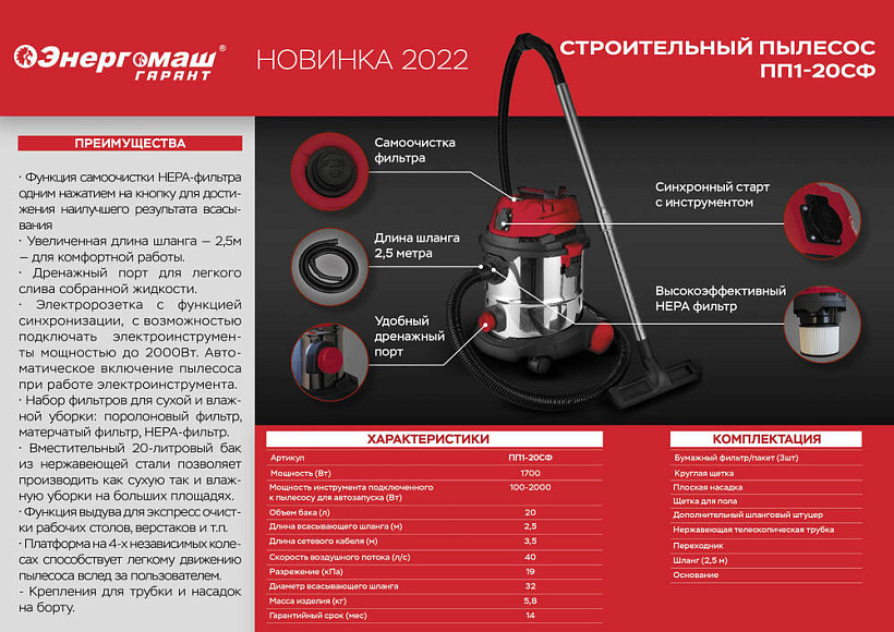 *Функция самоочистки фильтра одним нажатием на кнопку *Увеличенная длина шланга - 2,5м - для комфортной работы *Дренажный порт для легкого слива собранной жидкости *Электророзетка с функцией синхронизации, с возможностью подключать электроинструменты мощностью до 2000Вт. Автоматическое включение пылесоса при работе электроинструмента *Набор фильтров для сухой и влажной уборки: поролоновый фильтр, матерчатый фильтр, НЕРА-фильтр