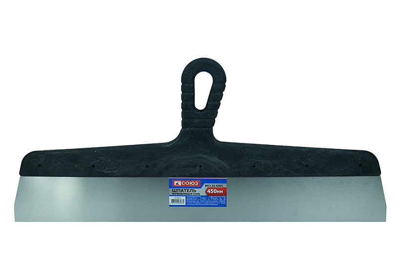 Шпатели с пластиковой ручкой СОЮЗ обладает широким полотном, которое позволяет быстро и равномерно наносить, выравнивать, сглаживать шпаклевочный слой на обрабатываемой поверхности. Инструмент обладает рабочей частью из нержавеющей стали и пластмассовой рукояткой для удобного удержания изделия, прослужит долгие годы без поломок, подходит для частого использования. Лезвие шпателя изготовлено из нержавеющей стали, которая отлично пружинит и сохраняет это свойство долгое время при эксплуатации.Удобство работ и хранение - обеспечивает эргономичная пластиковая ручка комфортная при удержании и ведении шпателя. Для удобства хранения у пластиковой ручки имеется отверстие для подвеса.