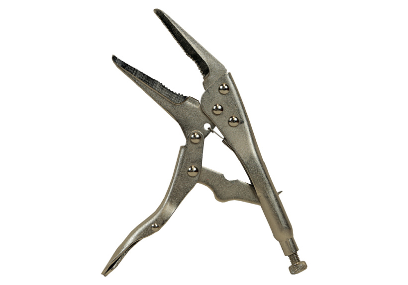 Ручной зажим с фиксатором предназначен для для удержания и надежной фиксации деталей при проведении слесарно-монтажных и сварочных работ. Фиксация происходит при сжатии рукояток инструмента до упора благодаря особой конструкции блокирующего механизма.
