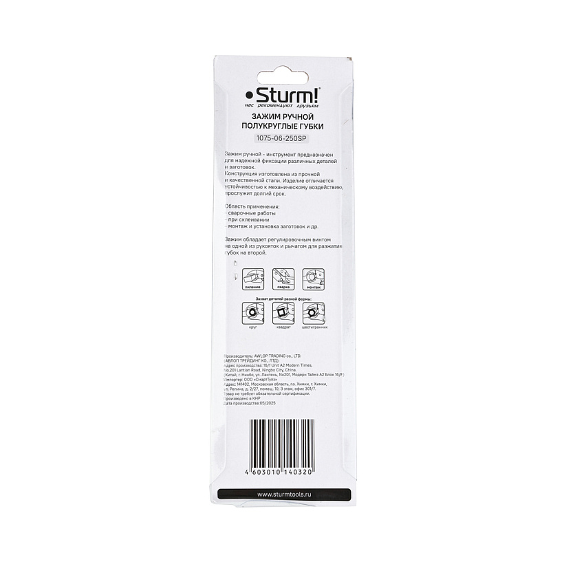 Зажим ручной, полукруглые губки, 250 мм, Sturm! PROMO