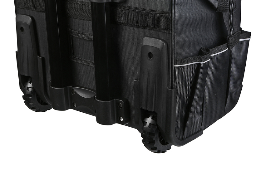 Колёсная система и телескопическая ручка для перемещения тяжёлого инструмента.Дополнительные вставки в стенки сумки позволяют ей лучше держать эргономичную форму при наполнении инструментом.