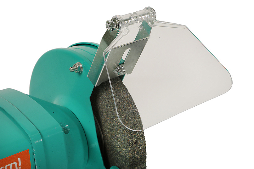 Прозрачный полимерный экран легко поворачивается на нужный угол, защищая оператора от вылета мелких частиц из-под вращающегося точильного круга, и помогая ему безопасно контролировать рабочий процесс.