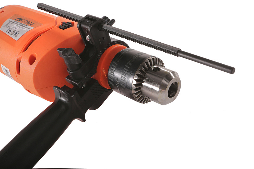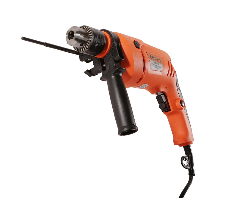 СОЮЗ ДУС-2180 - односкоростная универсальная дрель для бытового применения. За счет хорошо продуманной эргономики, дрель максимально удобна в использовании: прорезиненные накладки основной рукояти и возможность установки дополнительной рукояти в любом угловом положении способствуют надежности хвата, размещенные непосредственно под пальцами, флажковый переключатель реверса и регулятор количества оборотов гарантируют простоту управления, исключая лишние движения. Предусмотрена фиксация клавиши пуска для удобства непрерывной работы. Модель оснащена производительным 800 Вт электромотором, развивающим скорость вращения на валу шпинделя до 3000 об / мин – достаточный запас по мощности способствует высокой эффективности сверления в материалах различной твердости. Наличие ударного механизма позволяет уверенное использование дрели при работе с твердыми, но хрупкими материалами (керамика, керамогранит), без риска их повреждения. При необходимости, для повышения производительности, режим удара можно задействовать при сверлении отверстий в кирпичной кладке и легком бетоне. Диаметр шейки корпуса под европейский стандарт - 43 мм – обеспечивает возможность установки дрели в сверлильную стойку.