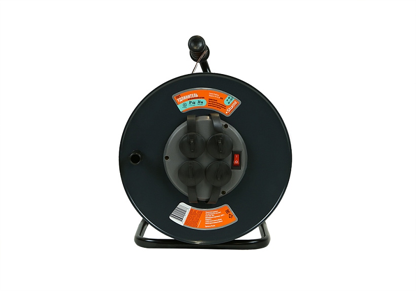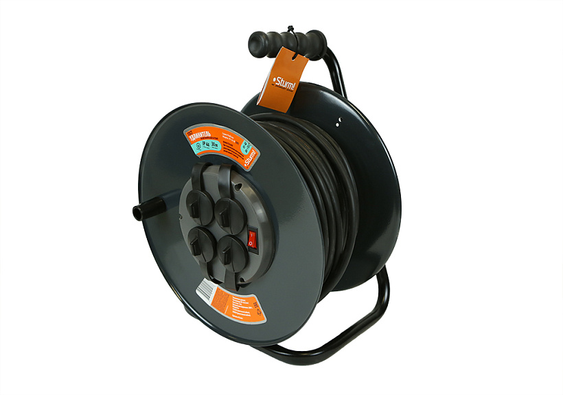 Шнур-удлинитель на катушке Sturm! с 4 гнездами предназначен для подключения электрических приборов и электроинструмента, когда недостаточно стандартной длины шнура для питания от стационарных розеток.