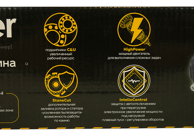В целях надежного и длительного использования ротор и статор, данной модели, дополнительно залиты лаком, что существенно повышает пылезащиту. Инструмент оборудован электродвигателем номинальной мощностью 2000 Вт для выполнения сложных задач, в том числе резки камня. Механизмы машины обеспечены фирменными подшипниками увеличенного ресурса.