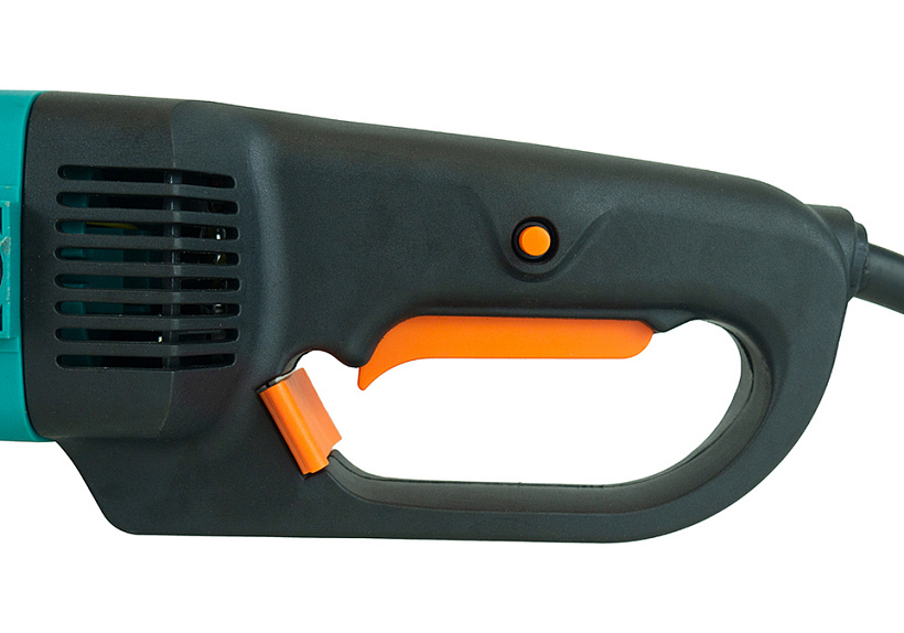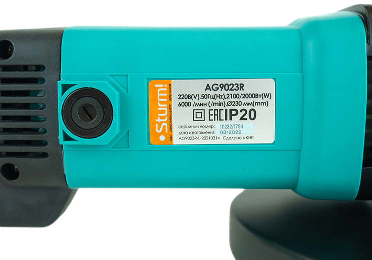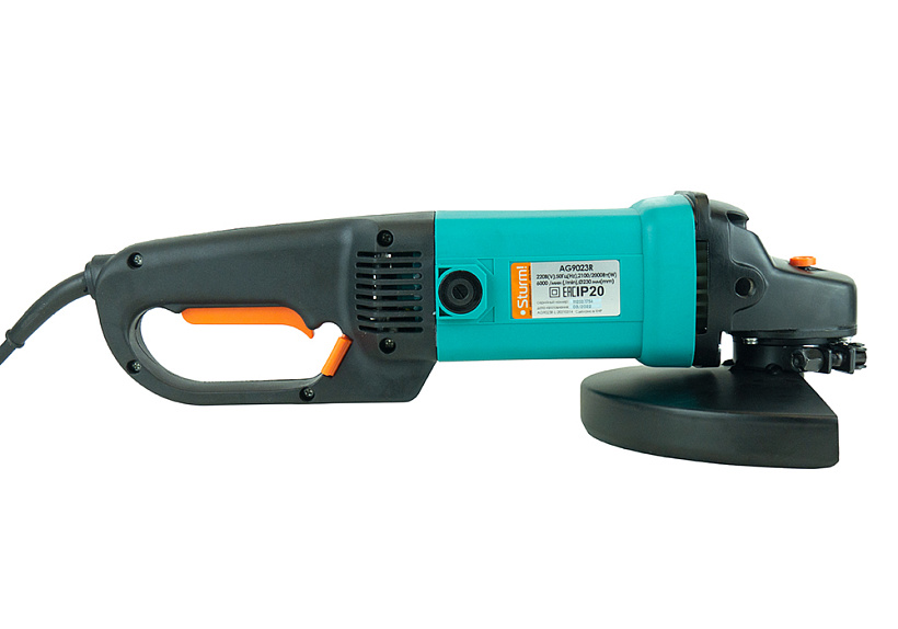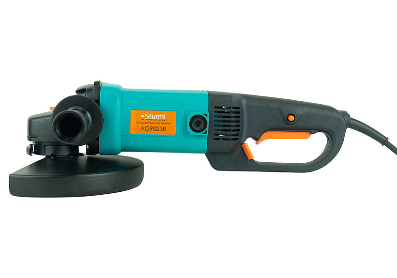 Sturm AG9023R – мощная универсальная болгарка (УШМ) бытового назначения под рабочий диаметр диска 230 мм. Оснащена производительным двигателем мощностью 2.1 кВт и усиленным коническим редуктором с шестернями повышенной твердости – уверенно справляется с резом арматуры, труб, профилей, а также зачисткой металлических поверхностей после сварки и механической обработки. Важной особенностью инструмента является наличие системы плавного пуска, снижающей пусковые нагрузки на двигатель и предотвращающей резкий рывок болгарки при старте. Модель имеет достаточно компактные, по меркам класса габаритные размеры и выверенные пропорции, что способствует лучшему ее контролю в процессе работы, а также хорошо продуманную эргономику: задняя рукоять выполнена поворотной (на угол 90 градусов в каждую сторону), передняя (дополнительная) рукоять в зависимости от предпочтений пользователя может устанавливаться в трех положениях. Модель проста в эксплуатации и обслуживании. Снабжена быстросъемным защитным кожухом, который надежно фиксируется при помощи специального зажимного рычага – такое решение позволяет при необходимости быстро изменять положение кожуха, не прибегая к помощи вспомогательного инструмента. Предусмотрена возможность быстрого доступа к щеткам, что существенно упрощает процесс их замены, так как исключает демонтаж элементов корпуса.