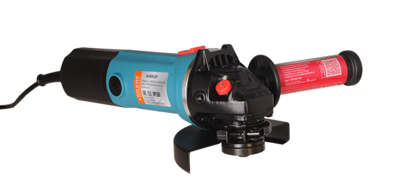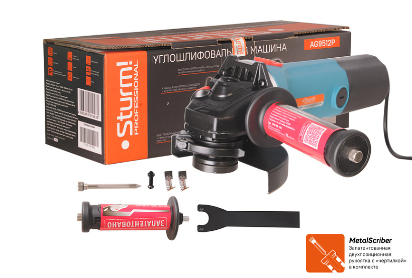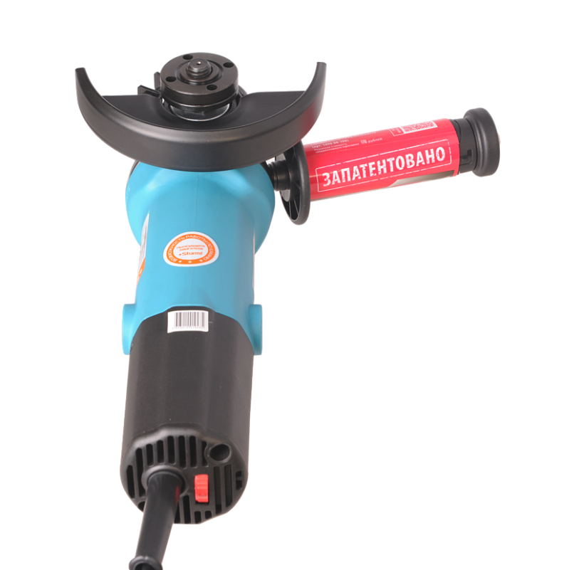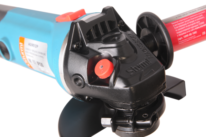 Об отличной приспособленности к зачистным и шлифовочным работам свидетельствует отдельные конструктивные решения: вал шпинделя установлен на двух шарикоподшипниках, забор воздуха в двигатель производится с торцевой части корпуса (со стороны сетевого кабеля), за счет чего значительно снижается возможность попадания в двигатель пыли и абразивных частиц, корпус редуктора вместо привычных двух имеет три гнезда под крепление дополнительной рукояти. Однако, ключевая особенность, обеспечивающая универсальность применения – наличие константной электроники, которая позволяет поддерживать одну и ту же частоту вращения на валу шпинделя, как на холостом ходу, так и под нагрузкой, препятствуя просадке по оборотам. Важной особенностью Sturm AG9512P является система плавного пуска – она снижает пусковые нагрузки на двигатель и предотвращает рывок инструмента в момент включения. Модель проста в эксплуатации и обслуживании. Снабжена быстросъемным защитным кожухом, надежно фиксирующимся при помощи специального зажимного рычага, не прибегая к вспомогательному инструменту, а также удобной обрезиненной патентованной рукоятью с твердосплавным разметочным карандашом внутри. Предусмотрена возможность быстрого доступа к щеткам, что существенно упрощает процесс их замены, так как исключает демонтаж элементов корпуса.
