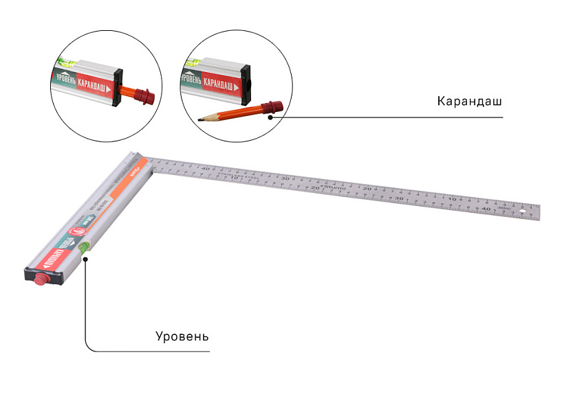 Переход от замера к разметке и обратно стал максимально быстрым, что в разы экономит время в процессе работы. Крепление осуществляется специально разработанной резиновой втулкой, которая надёжно удерживает карандаш, а так же позволяет его быстро извлечь и вернуть на место, исключая возможную потерю. Колба пузырькового уровня из ударопрочного плексигласа, полотно из нержавеющей стали с антикоррозийным покрытием, гравированная шкала устойчива в внешнему воздействию и сохранению точных показаний