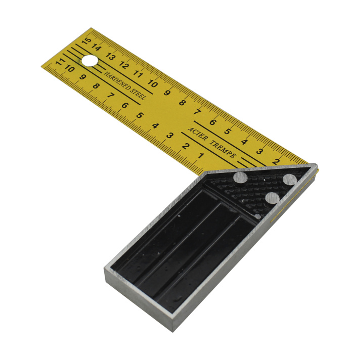 Преимущества товара: Шкала нанесена гравировкой с двух сторон, что добавляет удобство при работе. Полотно угольника изготовлено из закаленной нержавеющей стали,  рукоятка из алюминия, что обеспечивает защиту от коррозии, прочность и долговечность инструмента. Широкое основание и удобная алюминиевая рукоятка упрощают работу с инструментом.